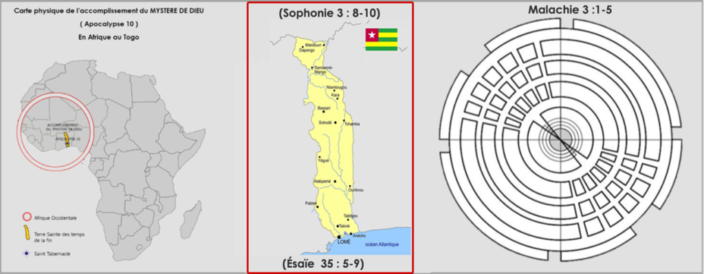 La prophétie d’Ésaïe (Ésaïe 18 : 3) sur cette trompette qui sonnera l’accomplissement du Mystère de Dieu, sera de nouveau confirmée dans l’Apocalypse (10 : 7 ). Cette trompette attendue depuis la montée au ciel de Jésus-Christ, vient de sonner sur le « Territoire au-delà du fleuve »(Togo). Cette prophétie d’accomplissement du Mystère de Dieu se réalise  dans ces temps de la fin à travers un Africain noir du « Territoire au-delà du fleuve »(Togo). Le mystère du Messie (Christ) qui fut caché aux fils d’Israël pendant des siècles et des siècles est maintenant révélé à un Africain noir du « Territoire au-delà du fleuve »(Togo); le mystère de l’arbre de vie du jardin d’Éden, resté silencieux depuis la chute d’Adam et Ève, est actuellement révélé à un Africain noir du « Territoire au-delà du fleuve » (Togo). Conformément au bienveillant dessein de Dieu, le Togo est continuellement la terre promise des temps de la fin, terre d’accomplissement du Mystère de Dieu.