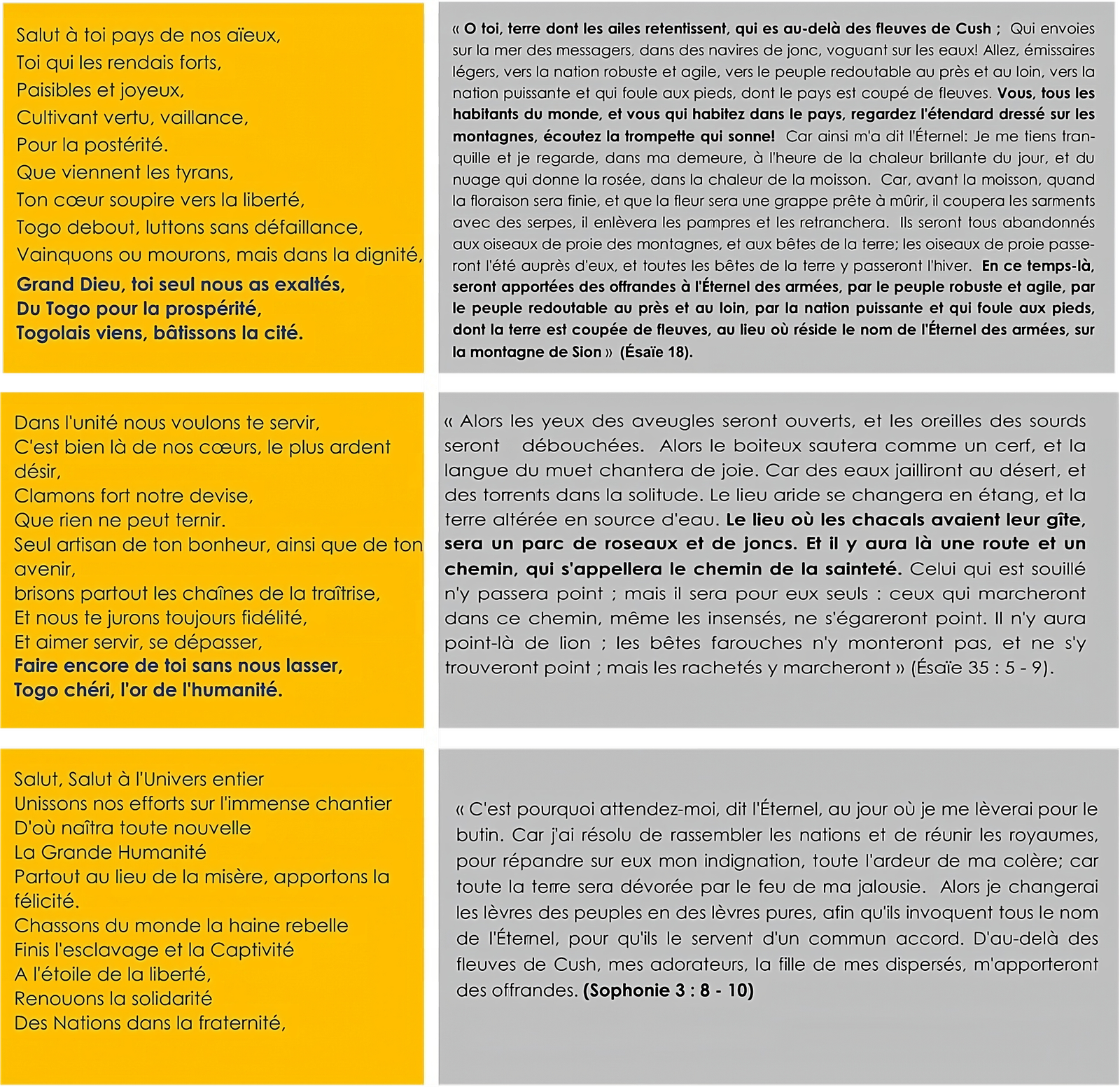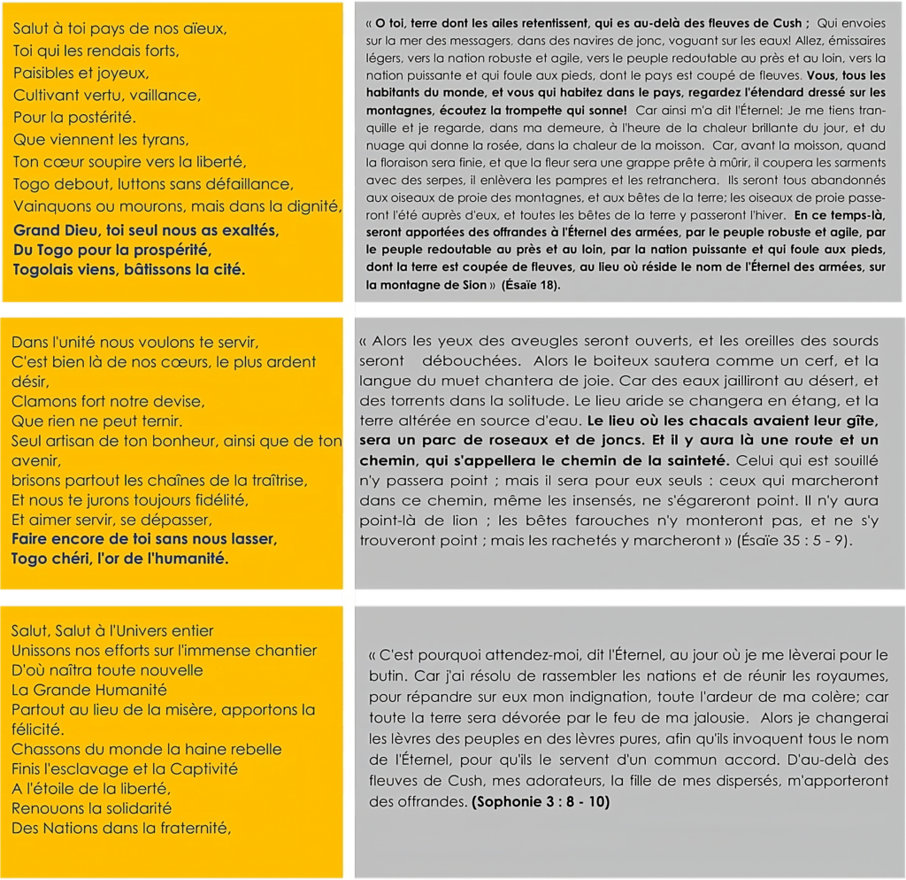 Cet hymne national est exclusivement prophétique et exceptionnel. Le Salut de l’humanité à partir de l’Afrique noire au Togo (Territoire au-delà du fleuve), s’était donc révélé dans l’hymne national de ce Pays élu de Dieu. Dans toute sa Sagesse, le Grand Dieu, le TOUT-SAINT s’est continuellement manifesté à son « Territoire au-delà du fleuve » tout au long de son achèvement prophétique, selon son bienveillant plan qu’il s’est proposé en lui-même pour l’administration dans les temps de la fin.